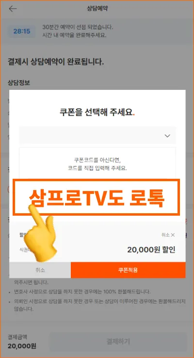제공받으신 쿠폰 코드를 상담료 결제 단계에서 입력하세요.