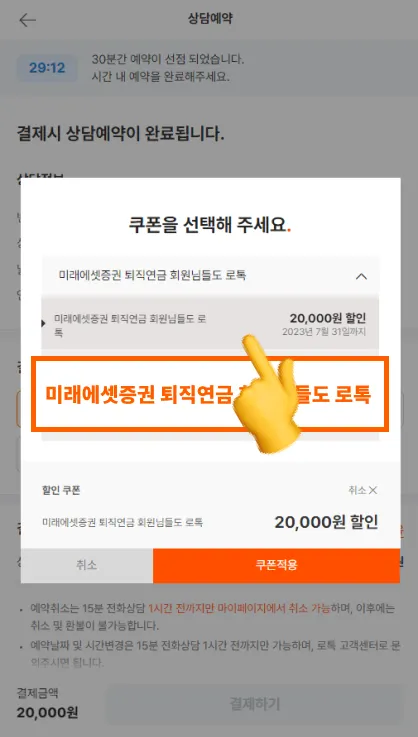제공받으신 쿠폰 코드를 상담료 결제 단계에서 적용하세요.