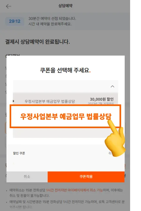 전화법률상담 1회에 사용할 수 있는 쿠폰의 최대 금액은 3만원으로 제한됩니다.