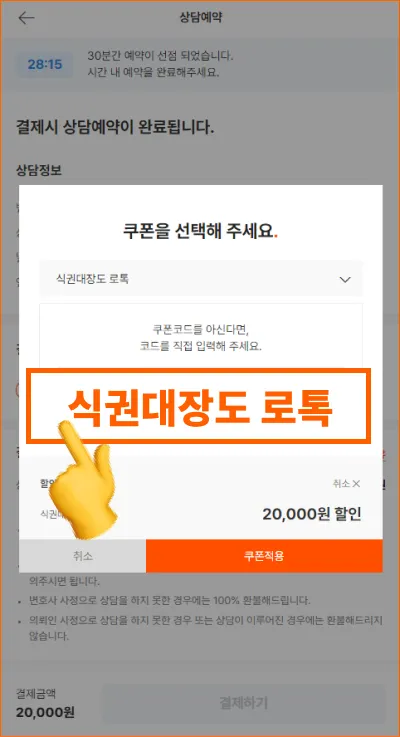 제공받으신 쿠폰 코드를 상담료 결제 단계에서 입력하세요.